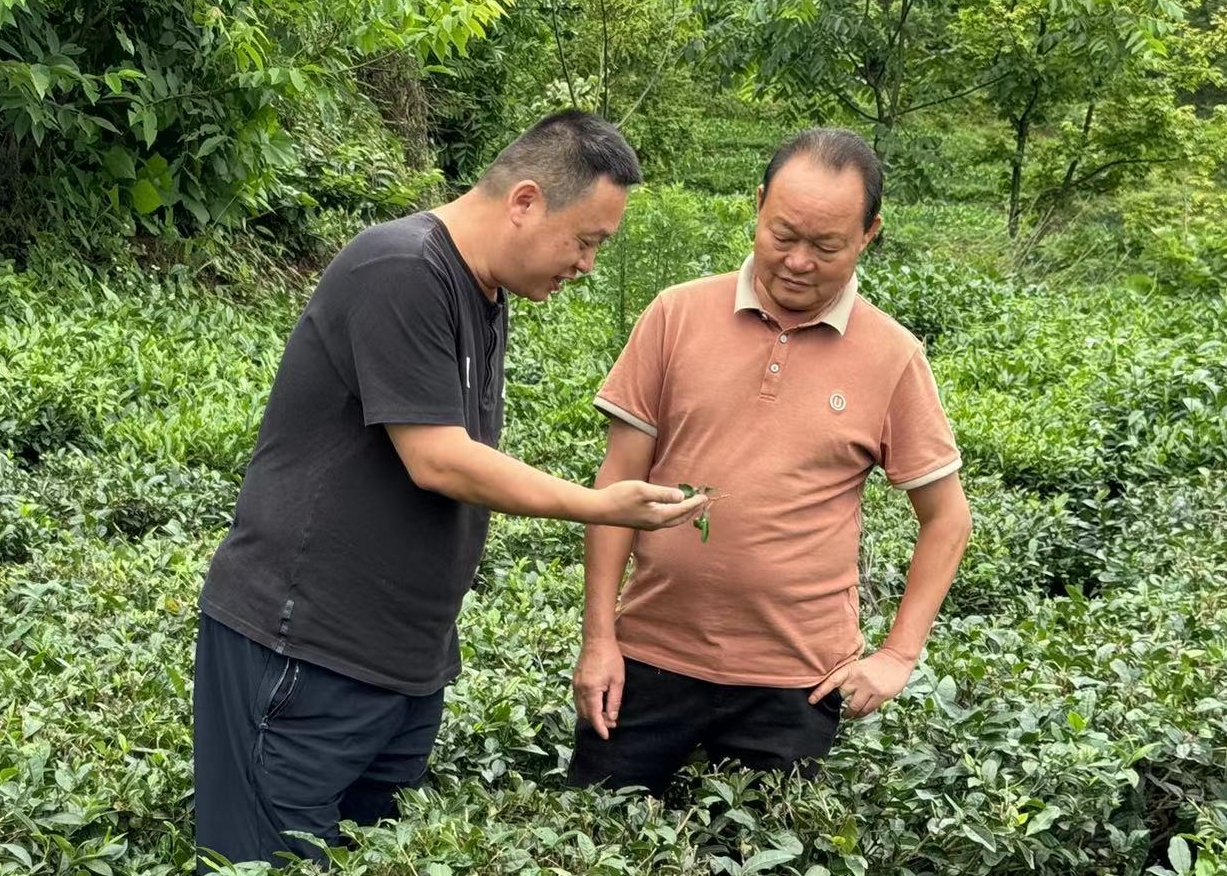 罗磊(左)查看茶叶生长情况